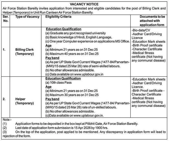 आवेदन जमा करने का पताः भर्ती के लिये इच्छुक उम्मीदवारों को अपना आवेदन इस दिनांक 15.04.2026 तक किसी भी कार्य दिवस में Air Force Station, Pilibhit Gate, Bareilly (UP) के पते पर रखे ड्राप बाक्स में सभी दस्तावेजों की स्वयं सत्यापित प्रतियों सहित जमा करना होगा।