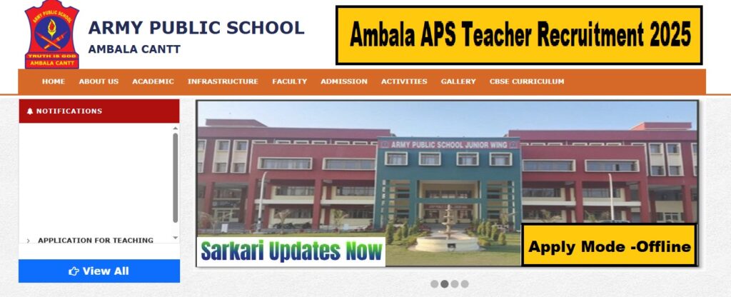 Ambala APS Teaching Recruitment 2025 : Here You Can Get All The Current And Upcoming Information Related To Ambala APS Teacher Recruitment 2025. Like Recruitment News, Ambala APS Teacher Recruitment 2025 Total Posts, Important Dates, Application Fees, Qualification, Age Limit, Ambala APS Teacher Recruitment 2025 Selection Process, Salary, Syllabus, Interview Date, Admit Card, Merit List, Ambala APS Teacher Recruitment 2025 Result and More.