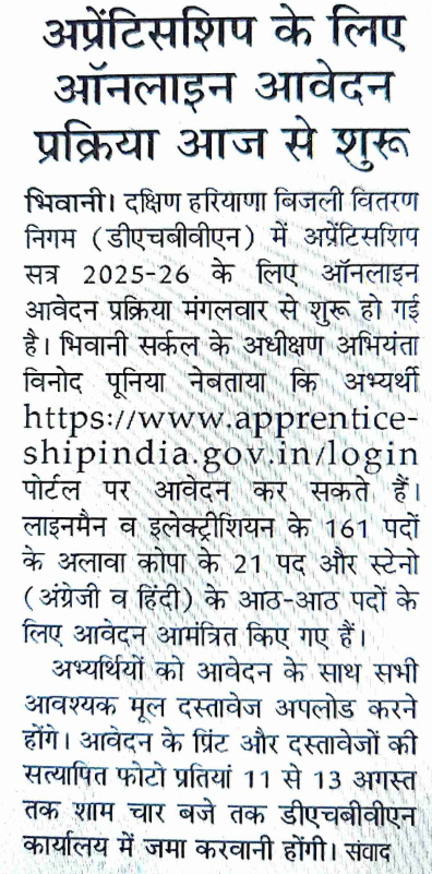 | Dakshin Haryana Bijli Vitran Nigam, Bhiwani (HR) Bhiwani DHBVN Apprentice Recruitment 2025 Short Details Of Advertisement Notification |
