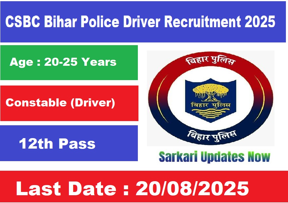 CSBC Bihar Police Driver Recruitment 2025 : Here You Can Get All The Current And Upcoming Information Related To CSBC Bihar Police Driver Recruitment 2025. Like Recruitment News, CSBC Bihar Police Driver Recruitment 2025 Total Posts, Important Dates, Application Fees, Qualification, Age Limit, CSBC Bihar Police Driver Recruitment 2025 Selection Process, Salary, Syllabus, CSBC Bihar Police Driver Recruitment 2025 Exam Pattern, Exam Date, Admit Card, Answer Key, Merit List, Result, CSBC Bihar Police Driver Recruitment 2025 Question Paper and More