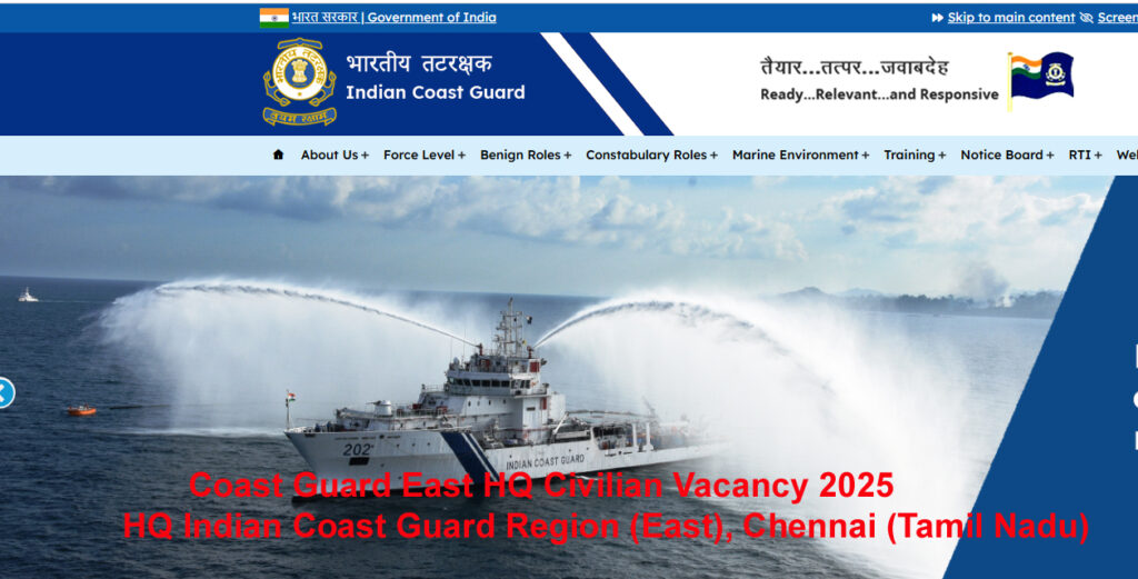 Coast Guard East HQ Civilian Recruitment 2025 : Here You Can Get All The Current And Upcoming Information Related To Coast Guard East HQ Civilian Recruitment 2025. Like Recruitment News, Coast Guard East HQ Civilian Recruitment 2025 Total Posts, Important Dates, Application Fees, Qualification, Age Limit, Selection Process, Coast Guard East HQ Civilian Recruitment 2025 Salary, Syllabus, Exam Pattern, Exam Date, Admit Card, Answer Key, Merit List, Result, Coast Guard East HQ Civilian Recruitment 2025 Question Paper and More.