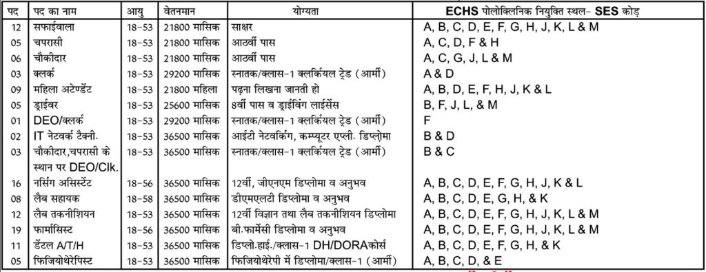 | OIC Polyclinic : Retired Service Officer (Graduate.) Drawing Pension (non Med), 05 Years Experience. Medical Specialist : MD/DNB in Gen Medicine, 03 Years Experience after Internship. Gynaecologist : MS/DNB in Gynae & Obst. 03 Years Experience after Internship. Medical Officer : MBBS Degree, 03 Years Experience after Internship. Nursing Assistant : GNM Diploma/Class-I Nursing Asst Course (Armed Forces), 05 Years Experience after Internship. Dental Officer : BDS, 03 Years Experience after Internship. Driver : 8″ Class-I MT Driver (Armd Forces) Possess a Civil Driving license, 05 Years Experience. Safaiwala : Literate. Data Entry Operator : Graduate/Class IClerical trade (Armed Forces). Clerk : Graduate / Class-I Clerical Trade (Armed Forces). For All Other Posts Qualification Read the Notification. |