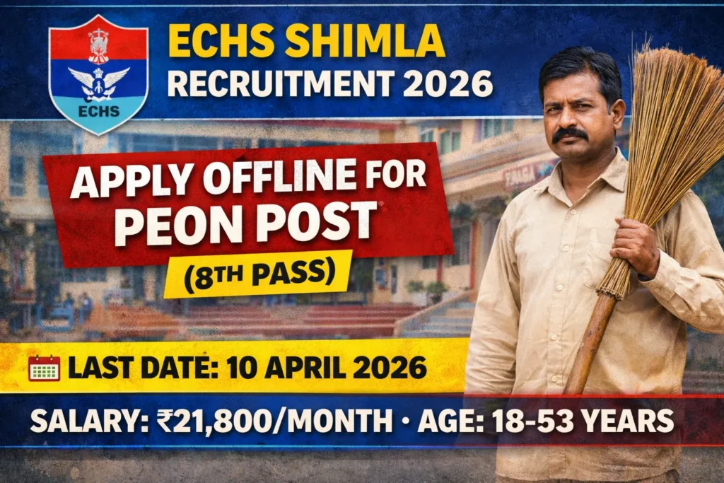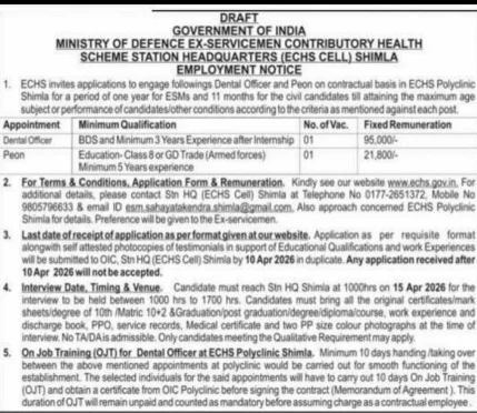 ECHS Shimla Vacancy 2026 : Ex-Servicemen Contributory Health Scheme issue the ECHS Shimla Vacancy Offline Application form for Peon Posts. Interested Candidate can apply through Sending/ Submitting their application form via By Post or By Hand. All details related to ECHS Shimla Recruitment 2026 are given below in this post.