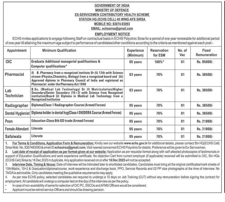 ECHS Sirsa Vacancy 2025 : The Ex-Servicemen Contributory Health Scheme Station HQ (ECHS CELL) Sirsa, Haryana, issue the ECHS Sirsa Vacancy Offline Application form for Peon, Safaiwala and Other posts. Interested Candidate can apply through Sending/ Submitting their application form via By Post or By Hand. All details related to ECHS Sirsa Recruitment 2025 are given below in this post