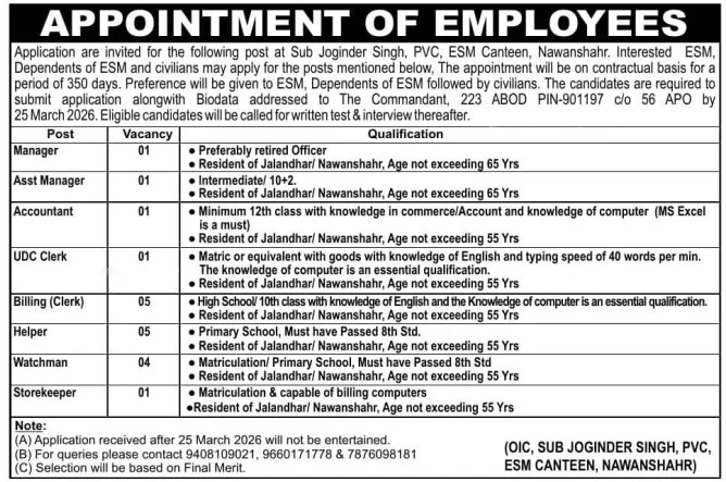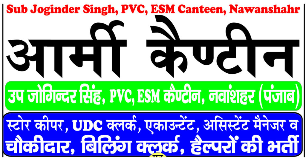 ESM Canteen Nawanshahr Vacancy 2026 : Army Canteen Board, Nawanshahr, Punjab issued the latest notification for the post of Store Keeper, UDC, Clerk, Accountant, Assistant Manager, Billing Clerk and Helper. Interested Candidate can apply through Sending/ Submitting their application form via By Post or By Hand. All details related to ESM Canteen Nawanshahr Vacancy 2026 are given below in this post.
