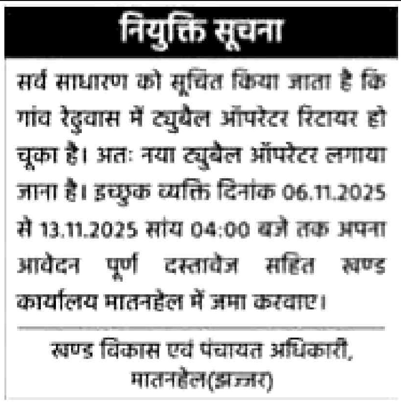 Haryana Tubewell Operator Vacancy 2025 : Gram Panchayat Kurana, Block Israna, Panipat issue the Haryana Tubewell Operator Vacancy Offline Application form for Tubewell Operator posts. Interested Candidate can apply through Submitting their application form via By Hand. All details related to Haryana Tubewell Operator Recruitment 2025 are given below in this post.