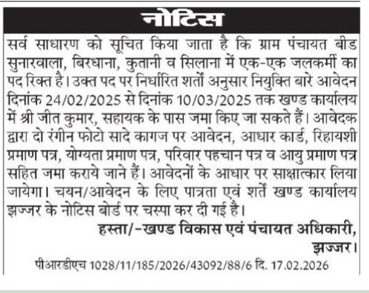 Haryana Tubewell Operator Vacancy 2026: Block Development and Panchayat Officer, District Jhajjar, Haryana issue the Haryana Tubewell Operator Vacancy Offline Application form for Tubewell Operator posts. Interested Candidate can apply through Submitting their application form via By Hand. All details related to Haryana Tubewell Operator Recruitment 2026 are given below in this post.