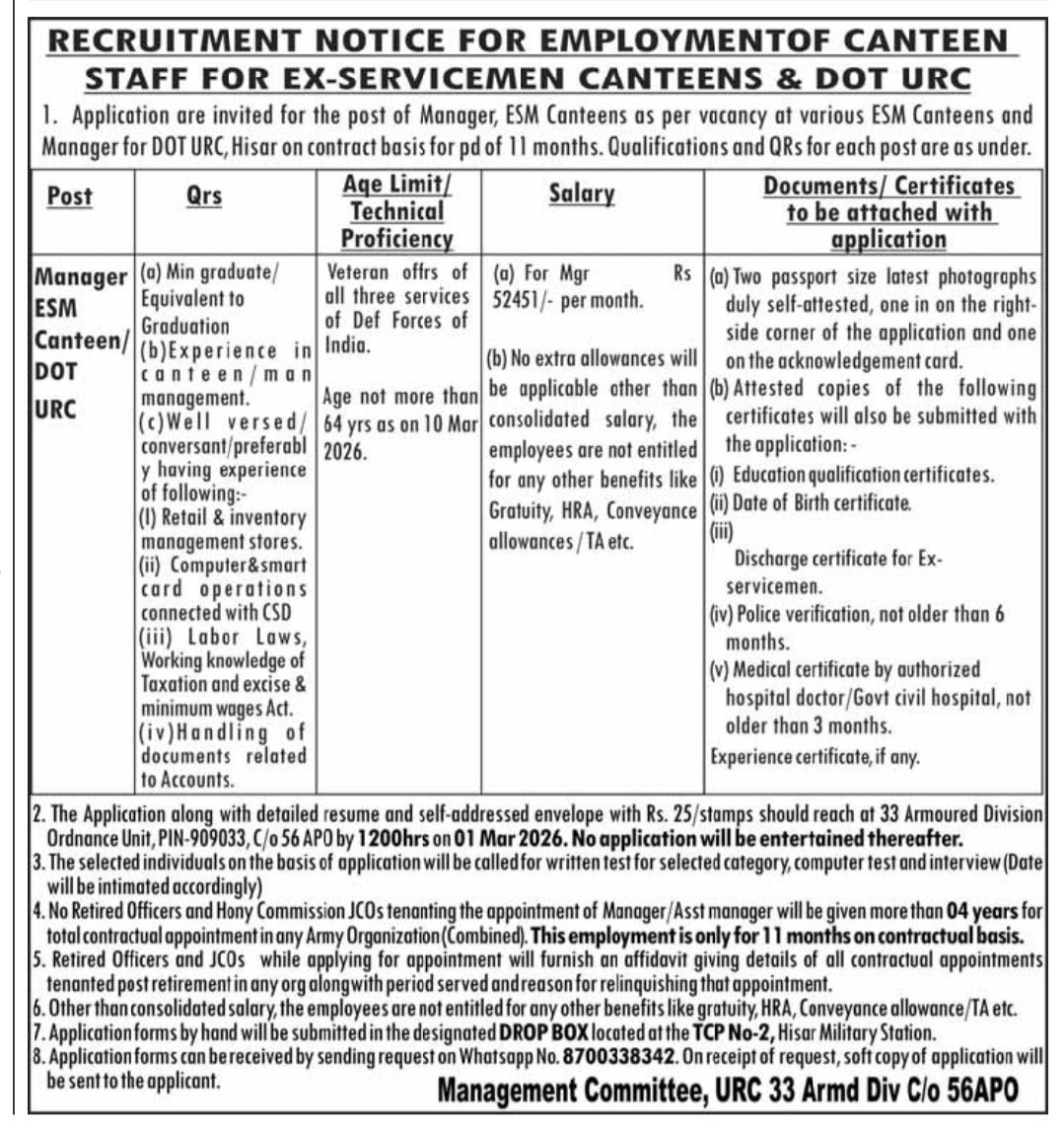 Hisar Military Canteen Vacancy 2026 : DOT URC Canteen Hisar Military Station issued the latest notification for the post of Manager for Veteran offrs of all three services of Def Forces of India. Interested Candidate can apply through Sending/ Submitting their application form via By Post or By Hand. All details related to Hisar Military Canteen Recruitment 2026 are given below in this post.