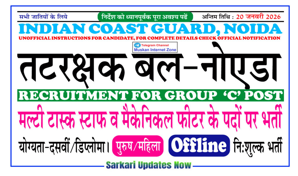 Indian Coast Guard invites applications from eligible Indian citizens (both male & female) for filling up the following vacancies through direct recruitment: Indian Coast Guard, Noida MTS Post Vacancy 2025 Total Posts, Important Dates, Application Fees, Qualification, Age Limit, Selection Process, Indian Coast Guard, Noida MTS Post Recruitment 2025 Salary, Syllabus, Exam Pattern, Exam Date, Admit Card, Answer Key, Merit List, Result,Indian Coast Guard, Noida MTS Post Recruitment 2025 Question Paper and More.