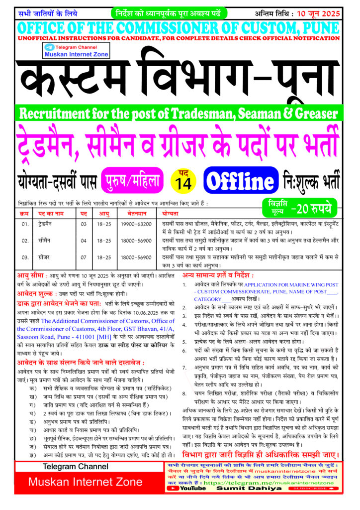 • आवेदन पत्र को “APPLICATION FOR MARINE WING POST – CUSTOMS COMMISSIONERATE, PUNE” शीर्षक के साथ भेजें और संबंधित पद का नाम (सीमैन, ग्रीसर या ट्रेड्समैन) स्पष्ट रूप से उल्लेख करें।