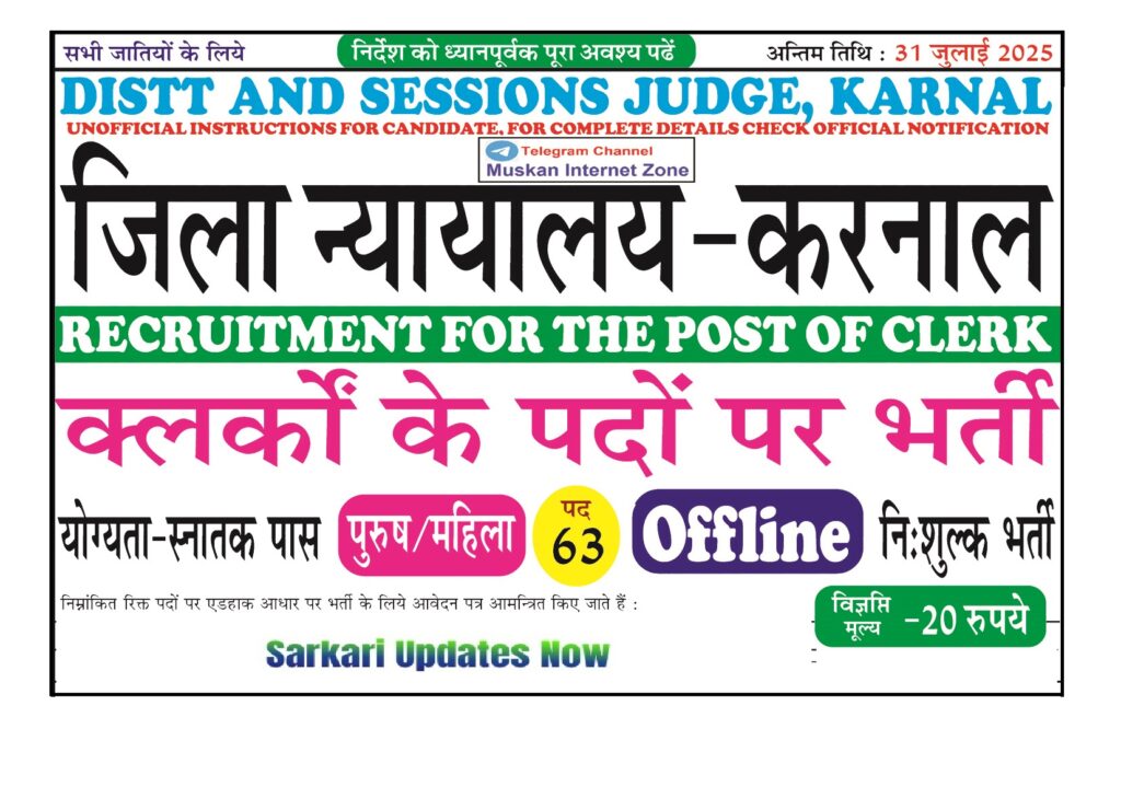 | District and Sessions Judge, Karnal (Haryana) Karnal Court Clerk Recruitment 2025 Short Details Of Advertisement Notification |