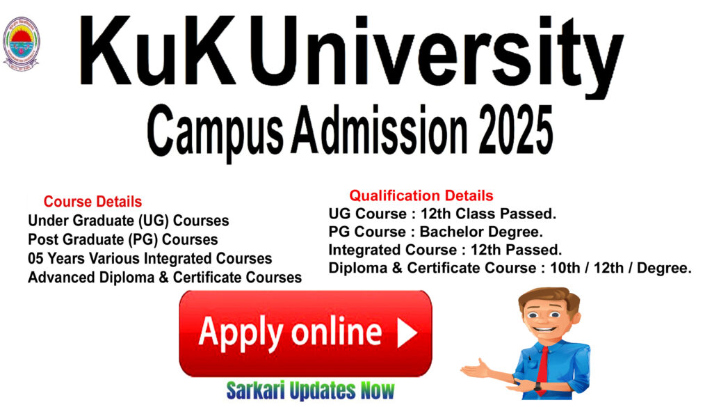 KUK UG / PG & Integrated Course Admission 2025-26 : Here You Can Get All The Current And Upcoming Information Related To KUK Admission 2025. Like Admission News, KUK Admission 2025 Total Seats, Important Dates, Application Fees, KUK Admission 2025 Qualification, Admission Process, Syllabus, Exam Pattern, KUK Admission 2025 Exam Date, Admit Card, Answer Key, Merit List, Result, KUK Admission 2025 Question Paper and More.