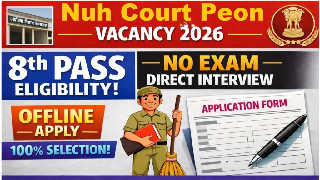 Nuh Court Peon Recruitment 2026 : Here You Can Get All The Current And Upcoming Information Related To Nuh Court Peon Vacancy 2026. Like Recruitment News, Nuh Court Peon Recruitment 2026 Total Posts, Important Dates, Application Fees, Qualification, Age Limit, Nuh Court Recruitment 2026 Selection Process, Salary, Interview Date, Admit Card, Merit List, Nuh Court Peon Recruitment 2026 Result and More.