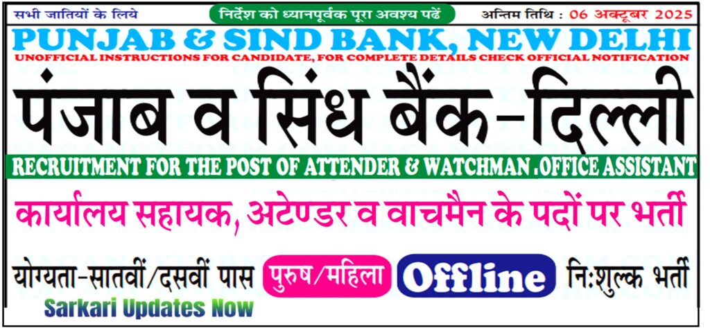 Punjab and Sind Bank Faculty, Office Assistant,Attender ,Watchman Recruitment 2025 Ref: HO/PSB-TDARE/Recruitment/1/2025-26 |