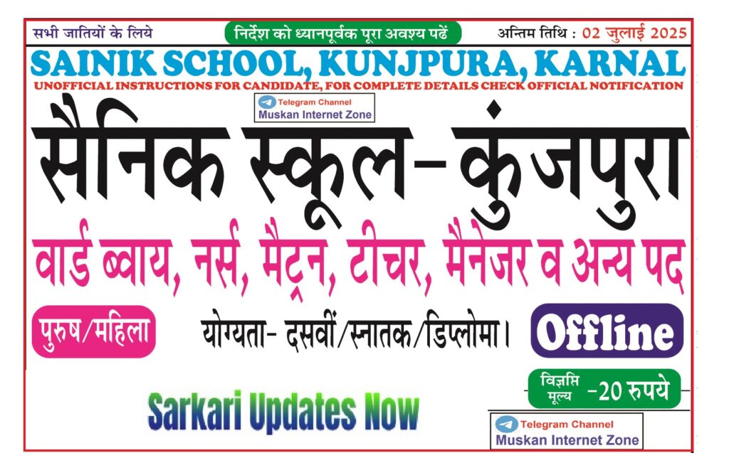 आवेदन शुल्क : 500 रुपये का बैंक ड्राफ्ट जो Principal, Sainik School, Kunjpura, Karnal के पक्ष में Karnal में देय हो। बैंक ड्राफ्ट के पीछे आवेदक अपना नाम, पद का नाम तथा पूरा डाक पता (मोबाइल नम्बर सहित) लिख देवें। बैंक ड्राफ्ट किसी भी राष्ट्रीयकृत बैंक के द्वारा जारी हो।