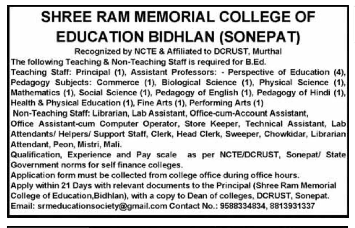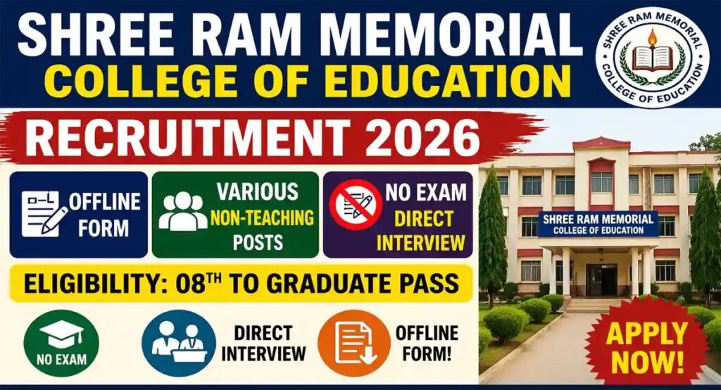 Shree Ram Memorial College Sonipat Vacancy 2026 : Shree Ram Memorial College of Education Bidhlan, Sonepat issued the latest notification for the post of Librarian, Lab Assistant, Office-cum-Account Assistant, Office Assistant-cum-Computer Operator, Store Keeper, Technical Assistant, Lab Attendants/Helpers, Clerk, Head Clerk, Sweeper, Chowkidar, Librarian Attendant, Peon, Mistri, and Mali. Interested Candidate can apply through Sending/ Submitting their application form via By Post or By Hand. All details related to Shree Ram Memorial College Sonipat Vacancy 2026 are given below in this post.