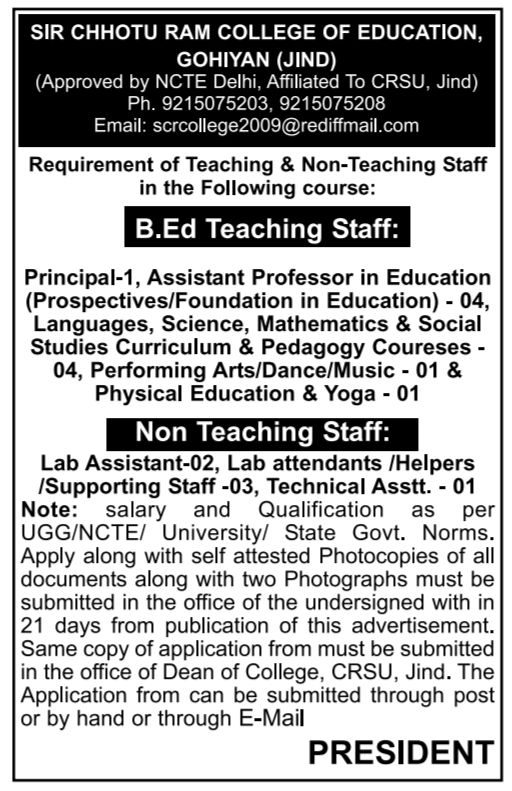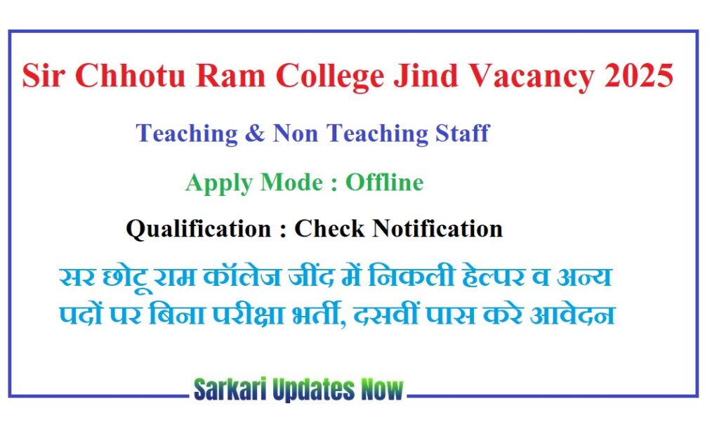Sir Chhotu Ram College Jind Vacancy 2025 : Sir Chhotu Ram College of Education, Jind issued the latest notification for the post of Lab Assistant, Lab Attendant / Helper / Supporting Staff Technical. Interested Candidate can apply through Sending/ Submitting their application form via By Post or By Hand. All details related to Sir Chhotu Ram College Jind Vacancy 2025 are given below in this post.