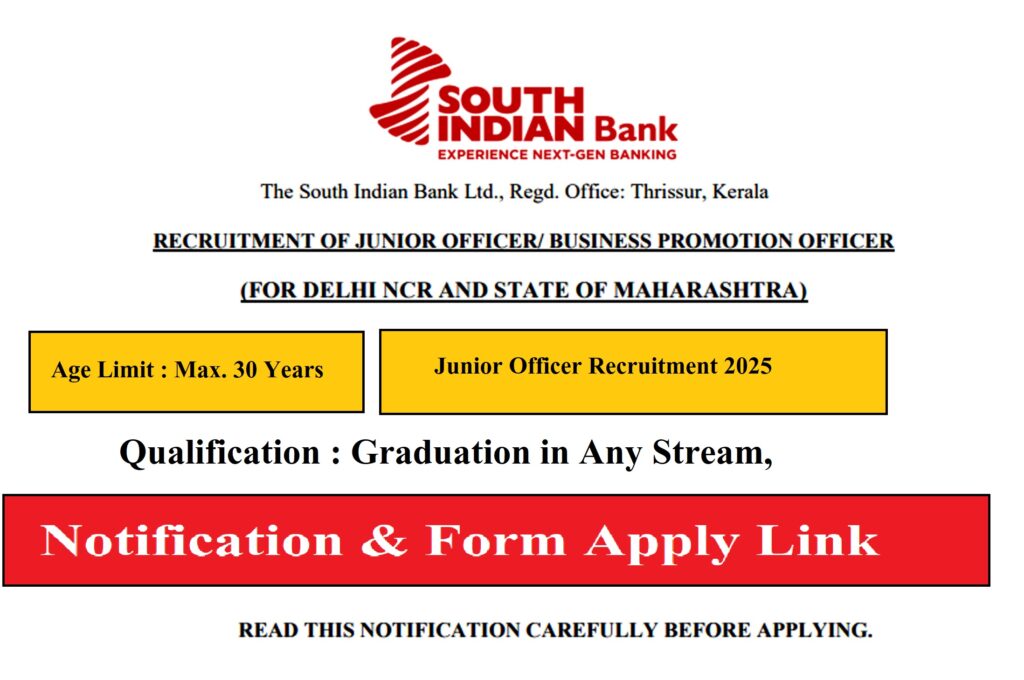 South Indian Bank Junior Officer Recruitment 2025 : Here You Can Get All The Current And Upcoming Information Related To South Indian Bank Junior Officer Vacancy 2025. Like Recruitment News, South Indian Bank Junior Officer Vacancy 2025 Total Posts, Important Dates, Application Fees, Qualification, Age Limit, South Indian Bank Junior Officer Vacancy 2025 Selection Process, Salary, South Indian Bank Junior Officer Vacancy 2025 Interview Date, Admit Card, Merit List, Result, and More.